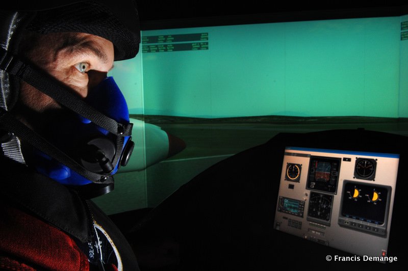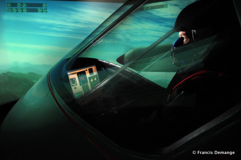 - Dans le simulateur de vol de l’avion solaire Solar Impulse. Bertrand Piccard teste le simulateur dans lequel il passera 25h d’affilee lors du vol virtuel du 13 mai 2008. L’outil ultra perfectionne servira par la suite a l’entrainement des pilotes.