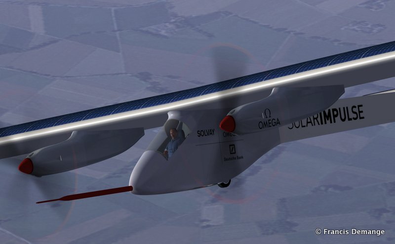 - Dans le simulateur de vol de l’avion solaire Solar Impulse. Bertrand Piccard et Andre Borschberg vont realiser le reve de tout pilote : voler perpetuellement de jour comme de nuit, en s’affranchissant des pleins de carburant.